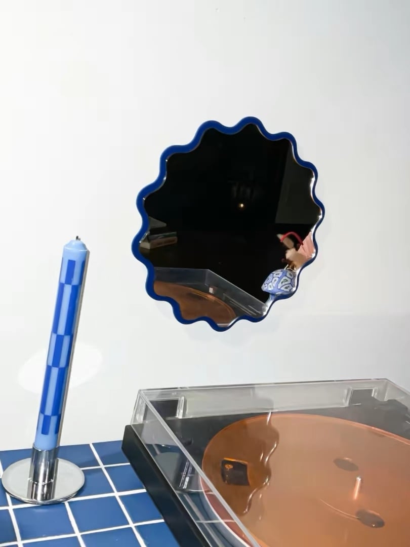 -Mirrored acrylic -Easy to hang with Command Strips (NOT INCLUDED) -Lightweight -11" in diameter approx.
